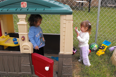 Oct 16 -Annastazia and her mom, Jillian, came over. The girls had a picnic lunch in the backyard and then played together in Kylee's play area. Kylee was very excited about the chips and zebra cakes that Annastazia brought to share.